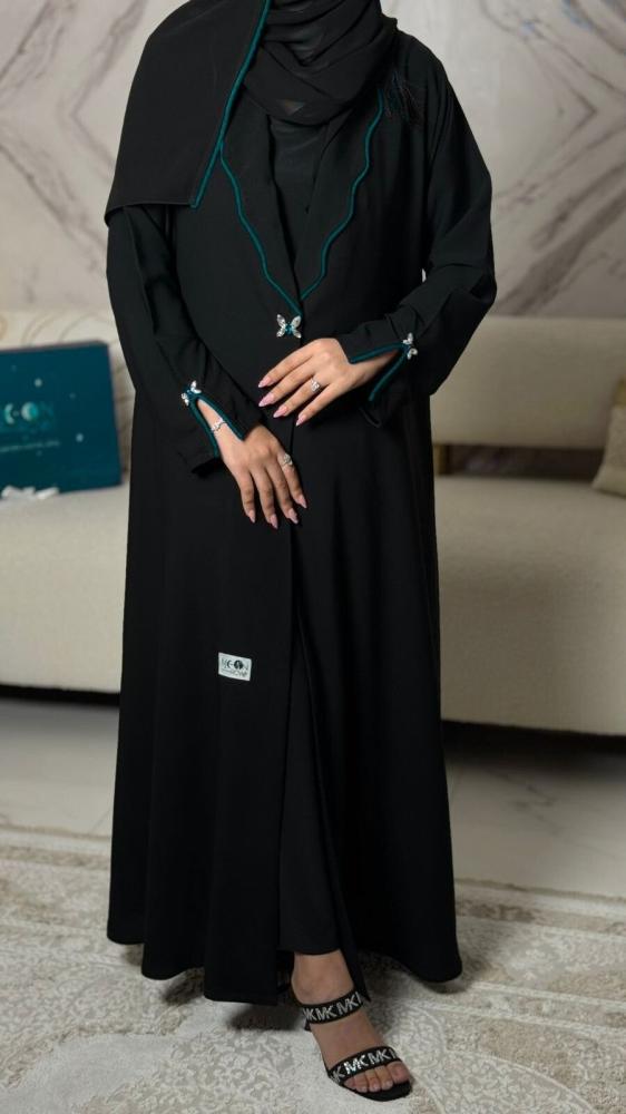 عباية بليزر كريب اسود خفيف مع تحديد لون اختياري اضاف لمسة من الجمال للموديل وتطريز شك يدوي مميز اضاف فخامة وتتميز بقوامها المريح