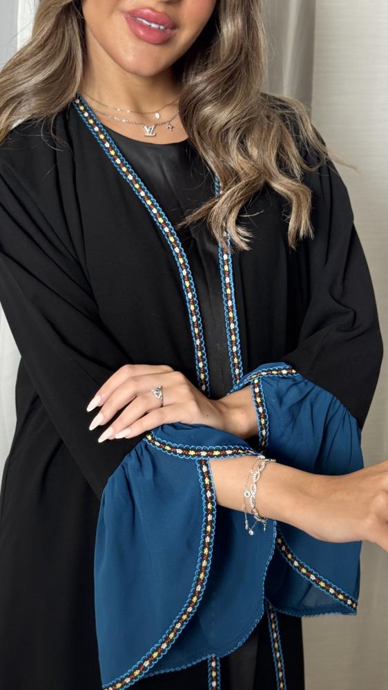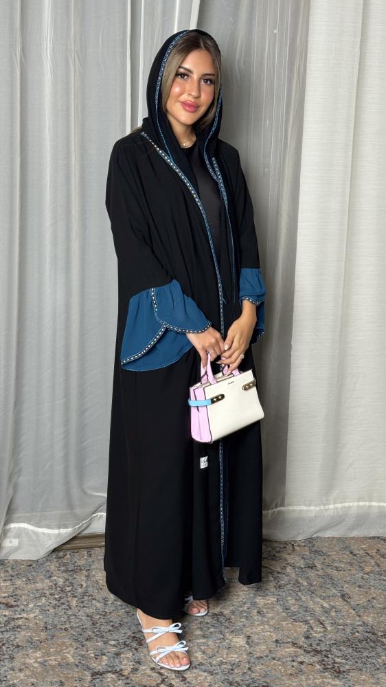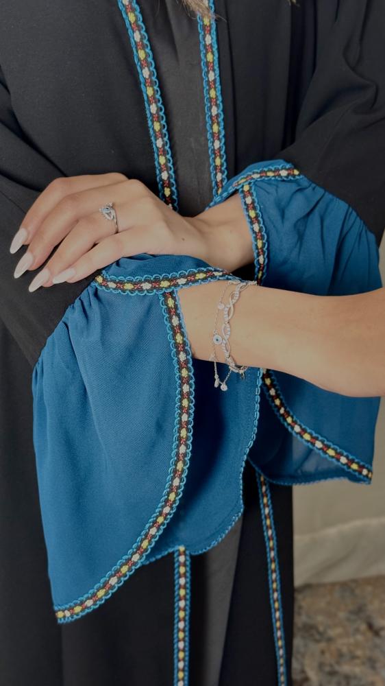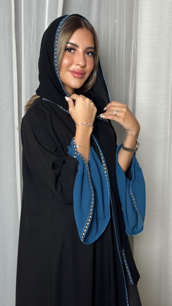 عباية سوداء انيقة بتفاصيل اكمام واسعه باللون الازرق الملكي ومزينة يتطريز ناعم على الاطراف مع تطريز مماثل مع الطرحة لمظهر متناغم وفخم يناسب الاطلالات العصرية والعملية ..